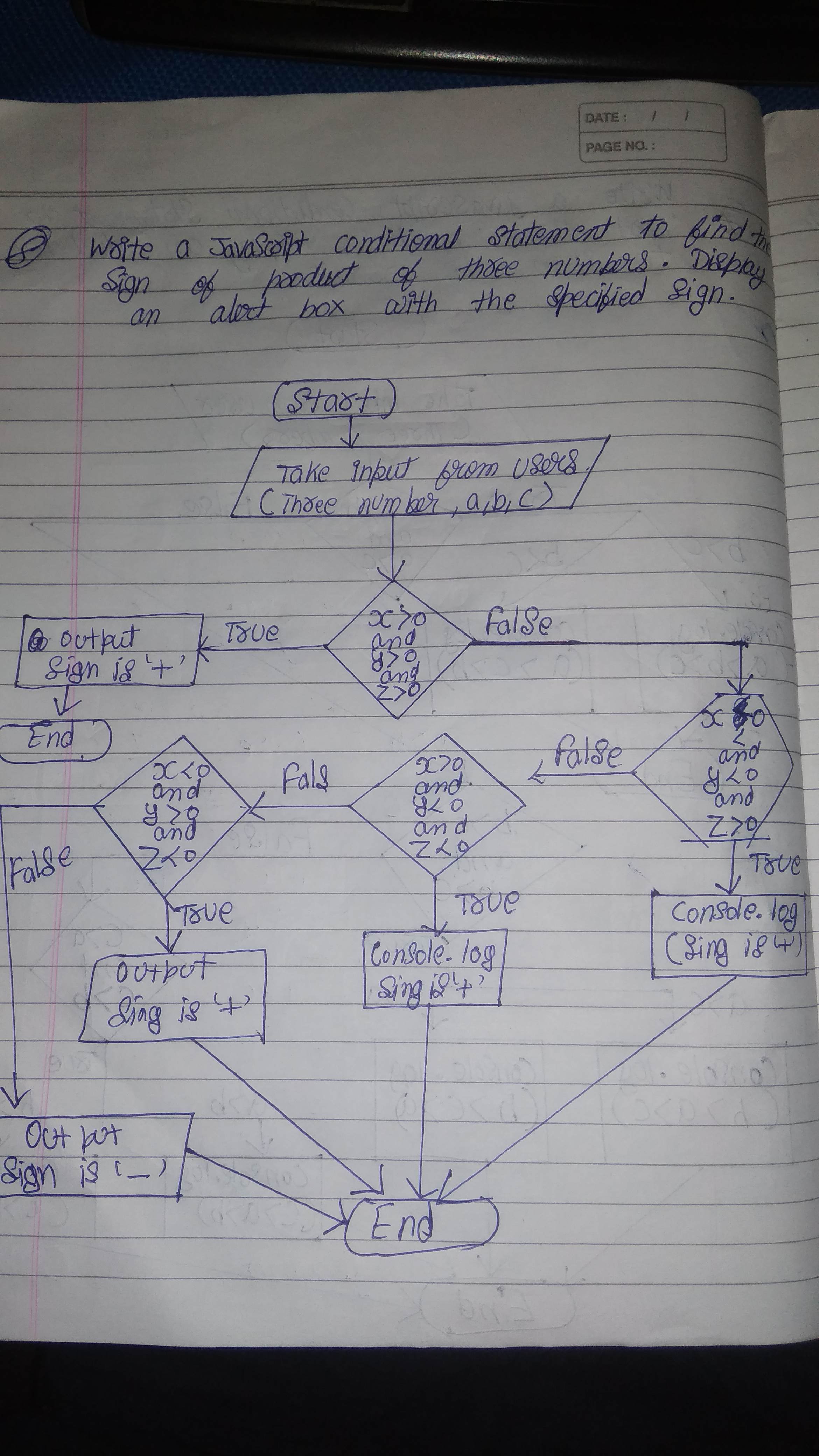 Write a JavaScript conditional statement to find the sign of product of three numbers. Display an alert box with the specified sign.